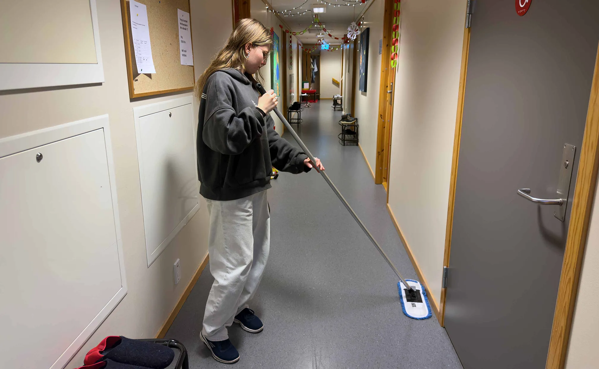 Det å bu på internatskule inneber pliktar – men òg verdifull læring. Kjøkkenteneste er noko alle deltek i.Det blir set opp ei liste med tre elevar per veke, som saman har ansvar for kjøkkentenesta den aktuelle perioden.